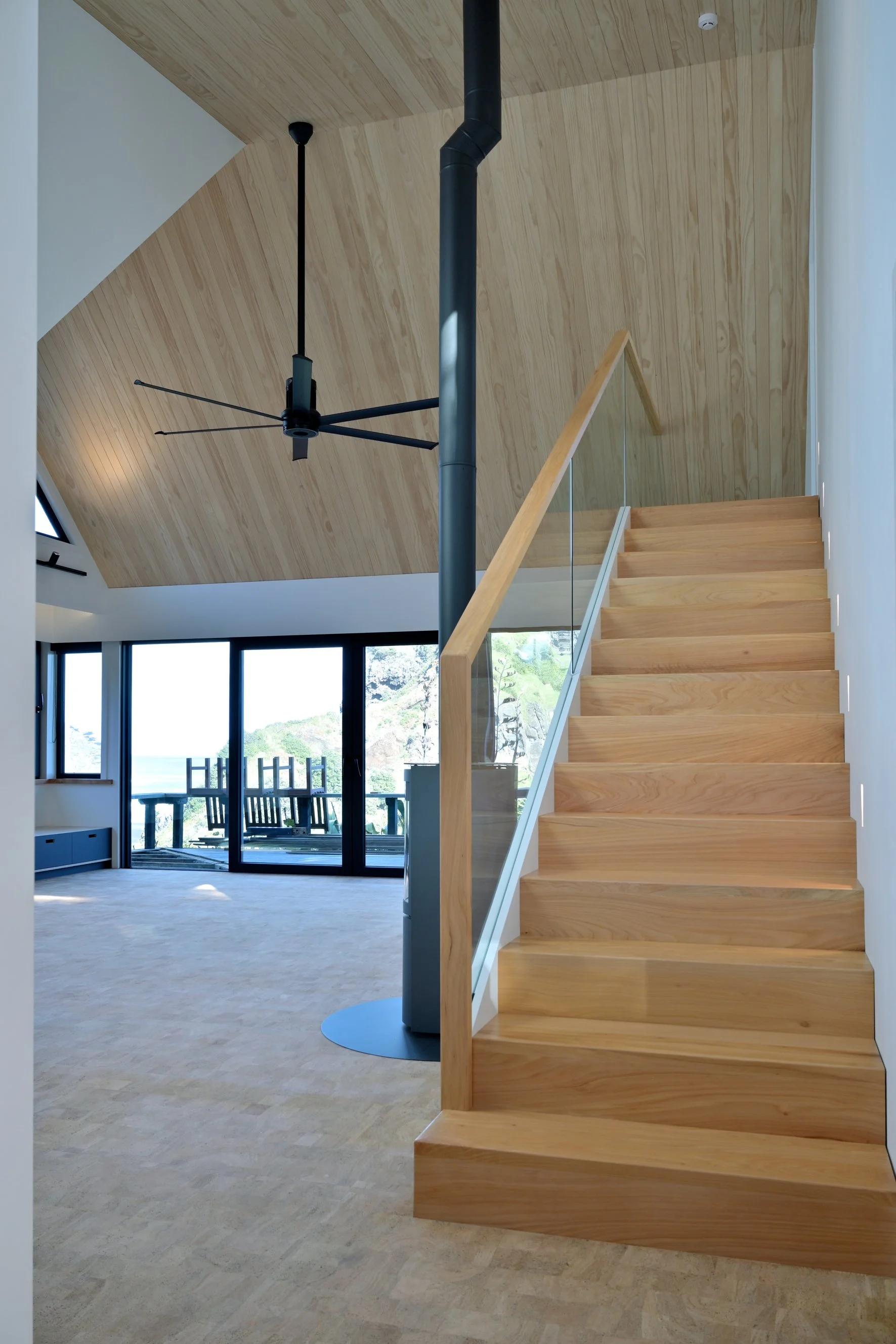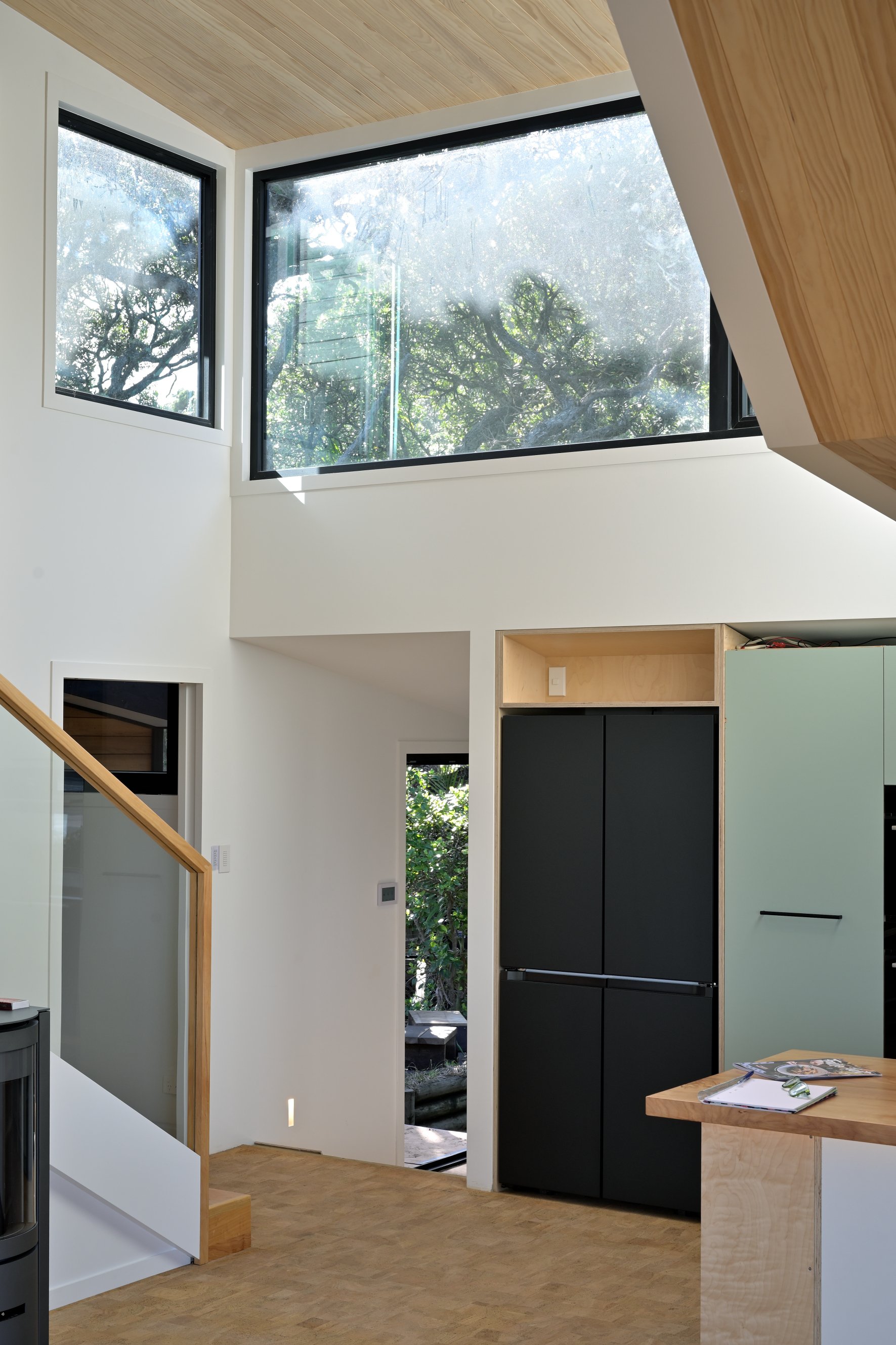 Perched on Garden Rd ridge, this once-tired 80’s weatherboard bach is being reworked to capture light, warmth, and the coastal views it had long been missing. The new southern addition extends the living volume, lined with warm timber battens overhead, while an east-facing dormer draws in the morning sun and frames the pohutukawa canopy beyond. Though compact in footprint, carefully crafted built-in furniture create a sense of generosity — a window seat for two doubles as dining seating, and a cosy nook beneath the stairs, surrounded by bookshelves, forms another quiet zone. With solar panels, UPVC joinery, and cork flooring, this small bach rebuild embraces sustainable design with an easy Piha spirit.
